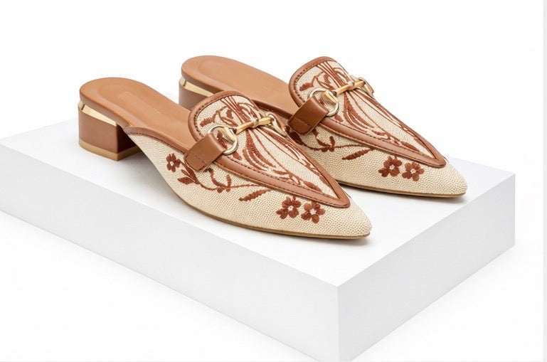Crafted with a comfortable 1-inch heel, this embroidered mule is designed for effortless elegance. The back-open structure ensures no biting, making it ideal for all-day wear. With a Pinterest-inspired pointed toe and rich embroidery, it offers a luxury, premium feel that stands apart from everyday footwear—elegant, refined, and unmistakably special.